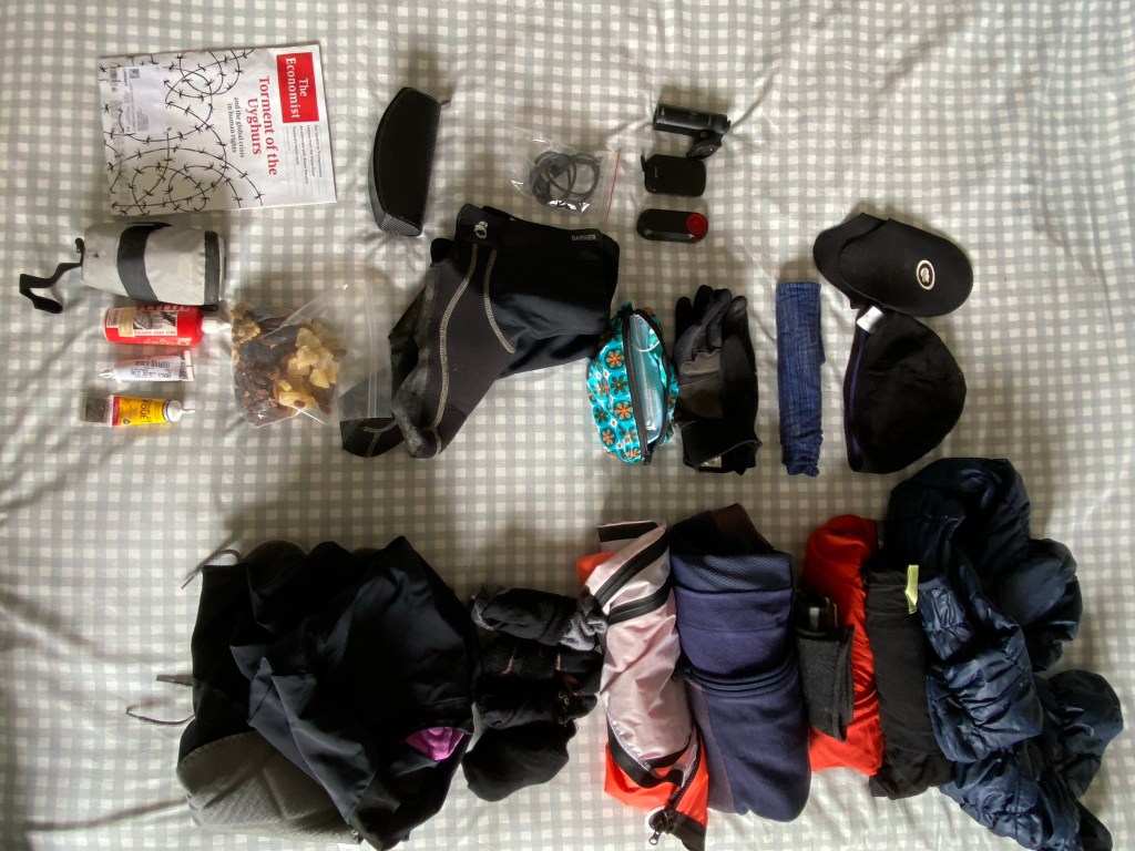 Packing as light but temperatures will be in single digitsYeah it all fits into two small panniersAnd the bike fits in the train