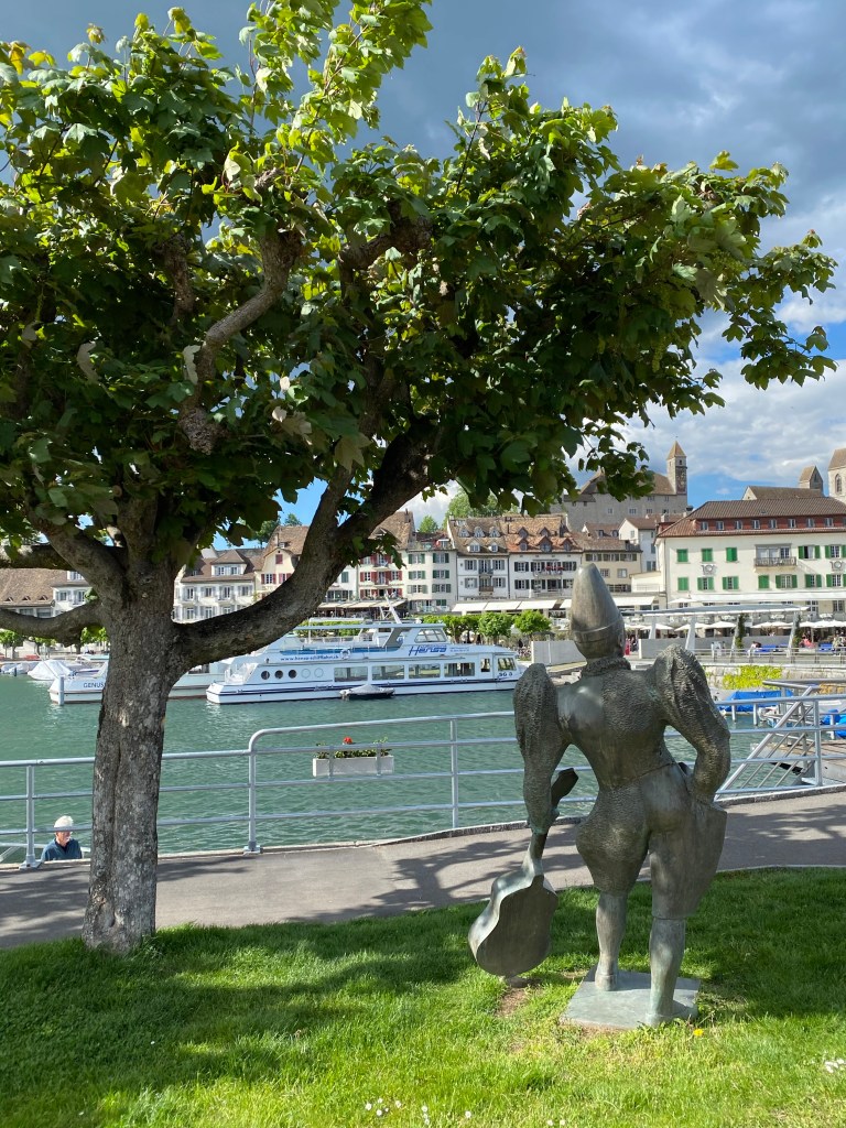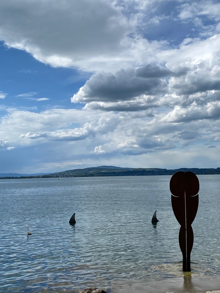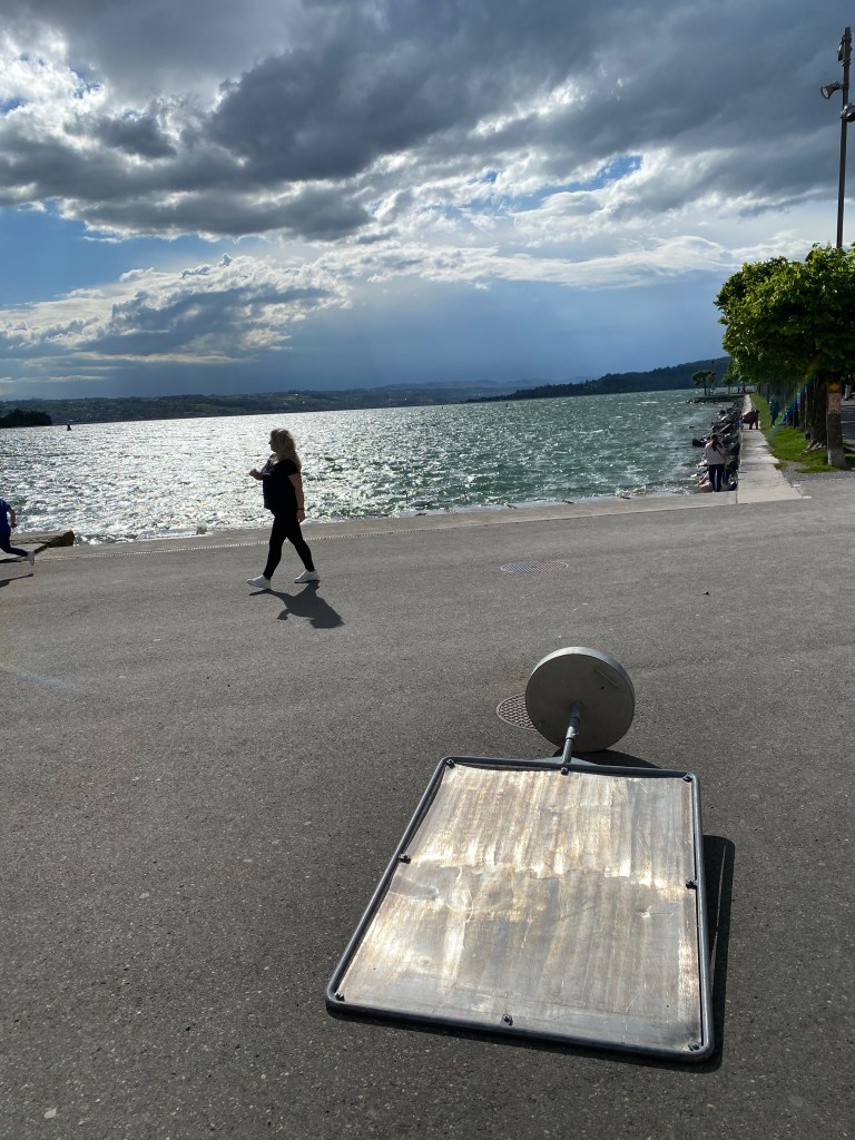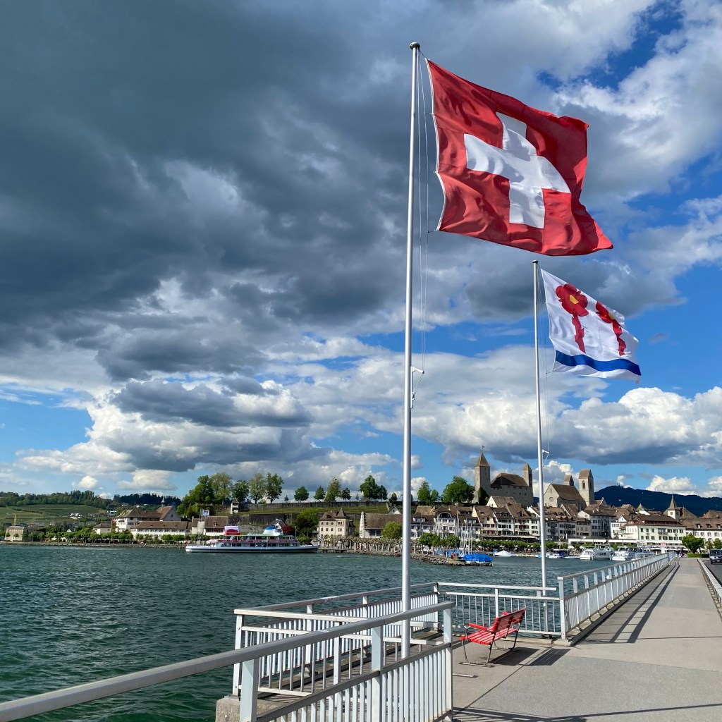 The view down the lake on the other side of the bridgeAbout halfway down one side of the lakeDid they eat the half that’s missingWhenever I could, I found some gravel paths Yikes I can see from the flags that cycling back to Zurich is going to be against a headwind Looking with my friend at RapperswilSigns of the strong wind I’m about to face head on Peaceful and bucolic on the Gold Coast side of the lakeWorth the visit