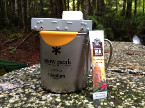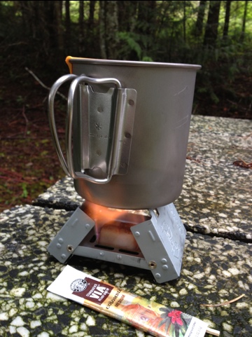 This morning I try what I think is the world’s lightest stove: An Esbitt. The titanium mug I bought came with two Starbucks instant coffee packets so here goes.