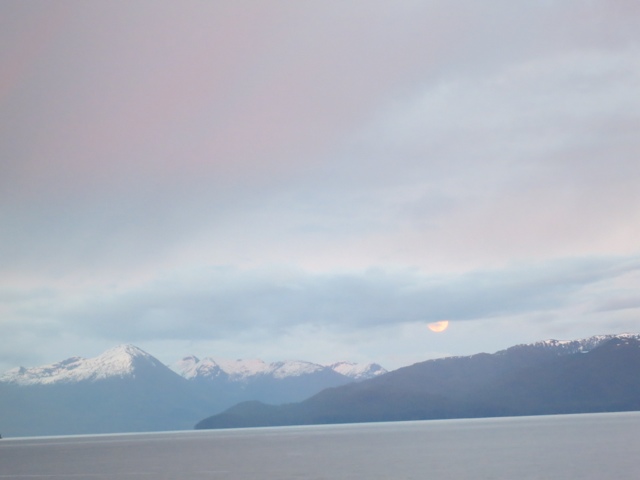 The sun sets as we power out of Prince Rupert and shortly after the moon rises. The best place on earth?