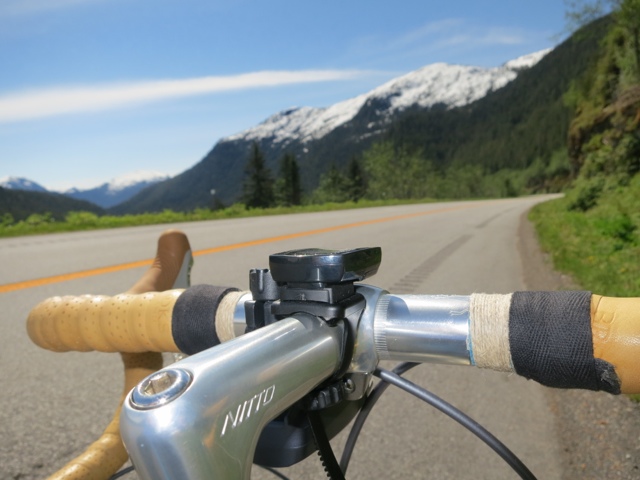 Massive snow capped mountains lined the entire journey along the Yellowhead Highway. And next to the road for most of the way was the wide and gentle flowing Skeena River and the CN railroad tracks. There was a modest headwind most of the day and it shifted around to a tailwind at kilometer 90 as a shower and its westerly wind blew me towards Terrace.