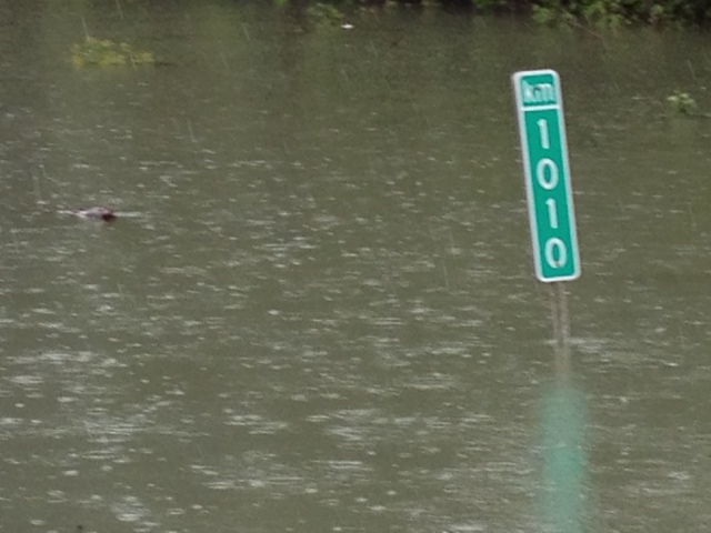Since leaving the west coast at Prince Rupert, every five kilometers has had a signpost. Here is the last one that I see. It is not meant to be in a river but every creek and river around has overflowed their banks.