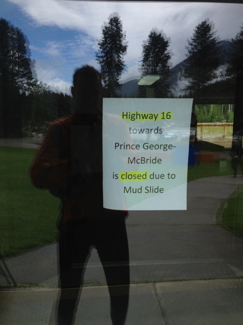 When leaving Tete Jaune, I see that road flaggers have closed the Yellowhead highway heading back towards McBride. It turns out that shortly after my hellish ride yesterday, there was massive landslide, as in eight feet of mud and car-sized boulders flowing across the highway. A risk that never occurred to me in the howling wind.