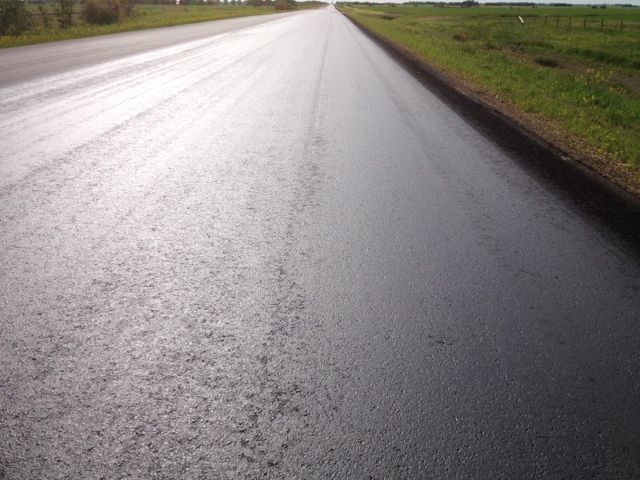 I catch up to where they are pouring the asphalt and the road flaggers wave me through to go on my own. All is fine but a little sticky. I want to cut across the section that was just being steamrolled as it led to the small town of Bawlf where I wanted to replenish my water. I figured if the steamroller could be rolling on it, so could my bicycle. Well, those who know more about such things know what happened next. Upon entering the freshly poured area, my tires sunk immediately down the the rim and I was about to fall over. Rather miraculously, because I had just put a coat of lubricant on my pedal cleats the day before, I managed to get one foot out of the cleat and catch myself going down. I quickly hobbled the bike out to the set asphalt area and did it quickly enough that my shoes and tires did not melt.