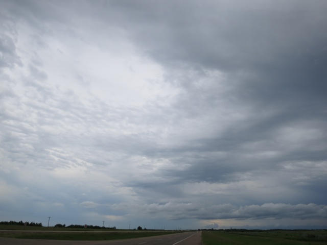 Rather than sit out the day in Macklin, we hatched a plan to go north and, if conditions are okay, pedal on the Yellowhead Highway again, with it’s wide shoulders. Unlike engaging in the increasingly popular sport of storm chasing, we play storm evading.