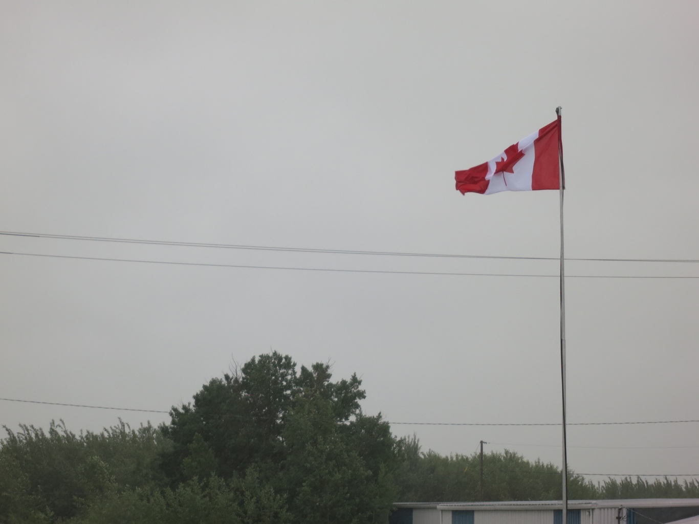 The tail end of the storm that has been beating up this part of Saskatchewan had one more day of power to throw at me. But at least it was all aimed at my back. The wind was blowing from the west with gusts from 60-90 km/hr. As long as it was a near perfect tailwind, I could manage it. It was a flat ride from North Battleford to Saskatoon and with the howling wind, it took very little effort to sustain speeds over 40km/hr. The flag, for once, is pointing in the direction I’m going.