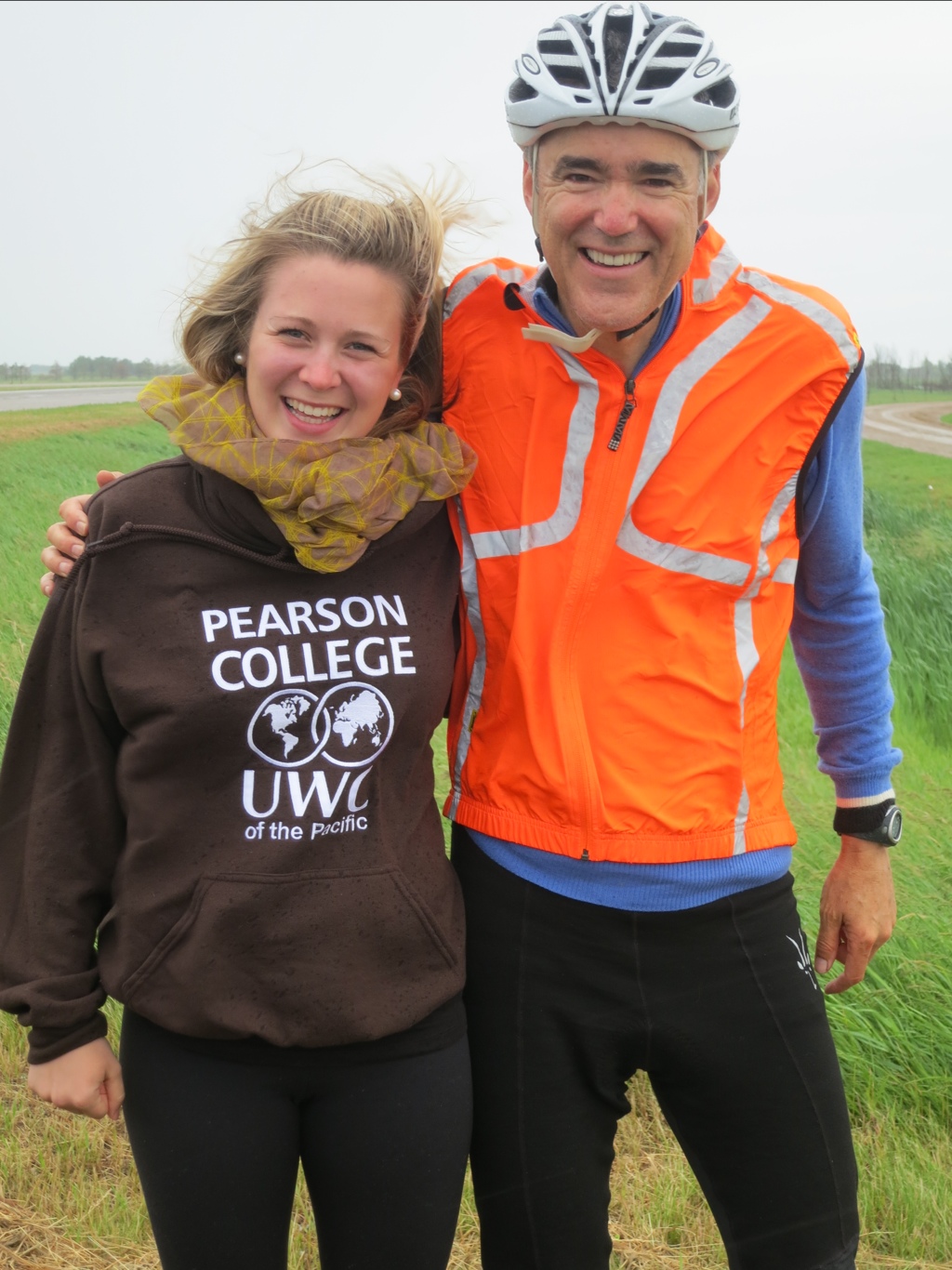 Before getting to Sakatoon, the rain picks up and drops visibility making it dangerous to be on the road. There were also a few kilometers where the road shoulder was no longer paved. Thank goodness for a very bright vest. I also get tracked down by an intrepid Pearson alum, Fawn Jackson, Pearson Year 31. She is the environmental specialist for the Canadian Cattle Ranchers Association, representing and communicating with their 85,000 members. Fawn was driving from Saskatoon to Calgary and knew I was on the road and stopped in the wind and rain to meet me, specially dressed for the occasion.