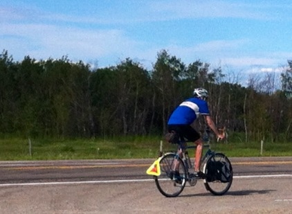 It is a flat run between Wynyard and Yorkton. I get the benefit most of the day of a gentle tailwind. Here is an effort by Leisa to get a photo of me on the road. The careful observer will note the one part of my body that is getting sunburned. My right calf.