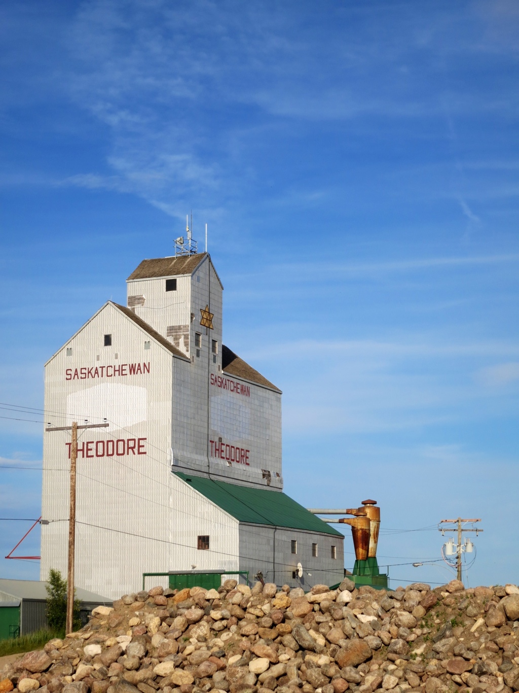 I make it to the town of Theodore, which has preserved its grain elevator. Shortly thereafter, I cycle over what must be a bed of razor sharp staples as I get a double puncture, all the way through the thick rubber, carbon and Kevlar tire bead.