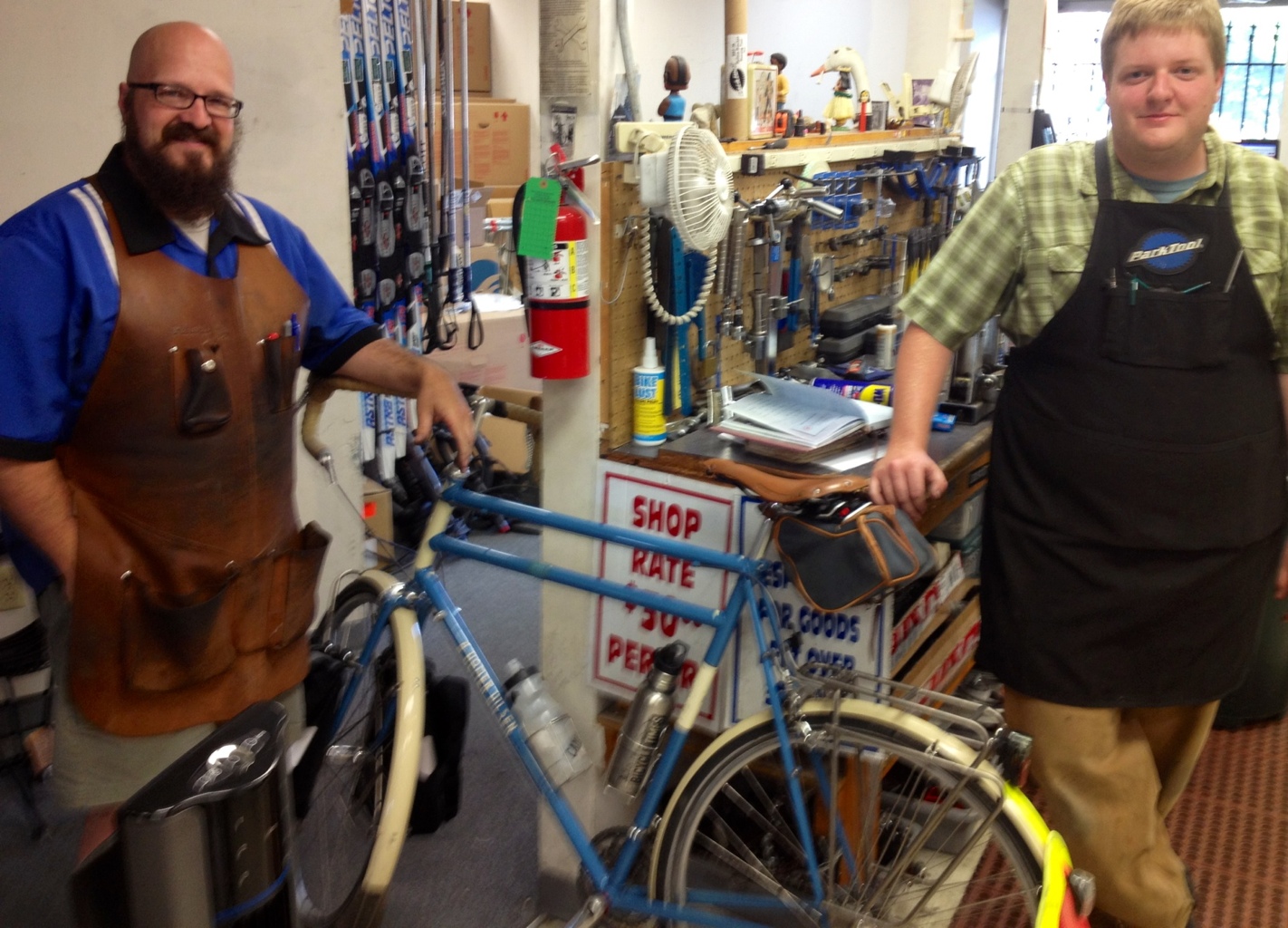 It has been nearly 2,500 km since I checked the stretch of my chain so I make my way to the Ski and Bike Shop in Grand Forks. Turns out it was 100% of the maximum stretch. The staff at Ski and Bike were terrific and Erik quickly replaced the chain, took off the cheap oil the new one was coated with and lubricated it with Boeshield T-9, the same lubricant I have been using. It was great to chat with people really into bikes. Check out the leather apron on the other mechanic, Dave.