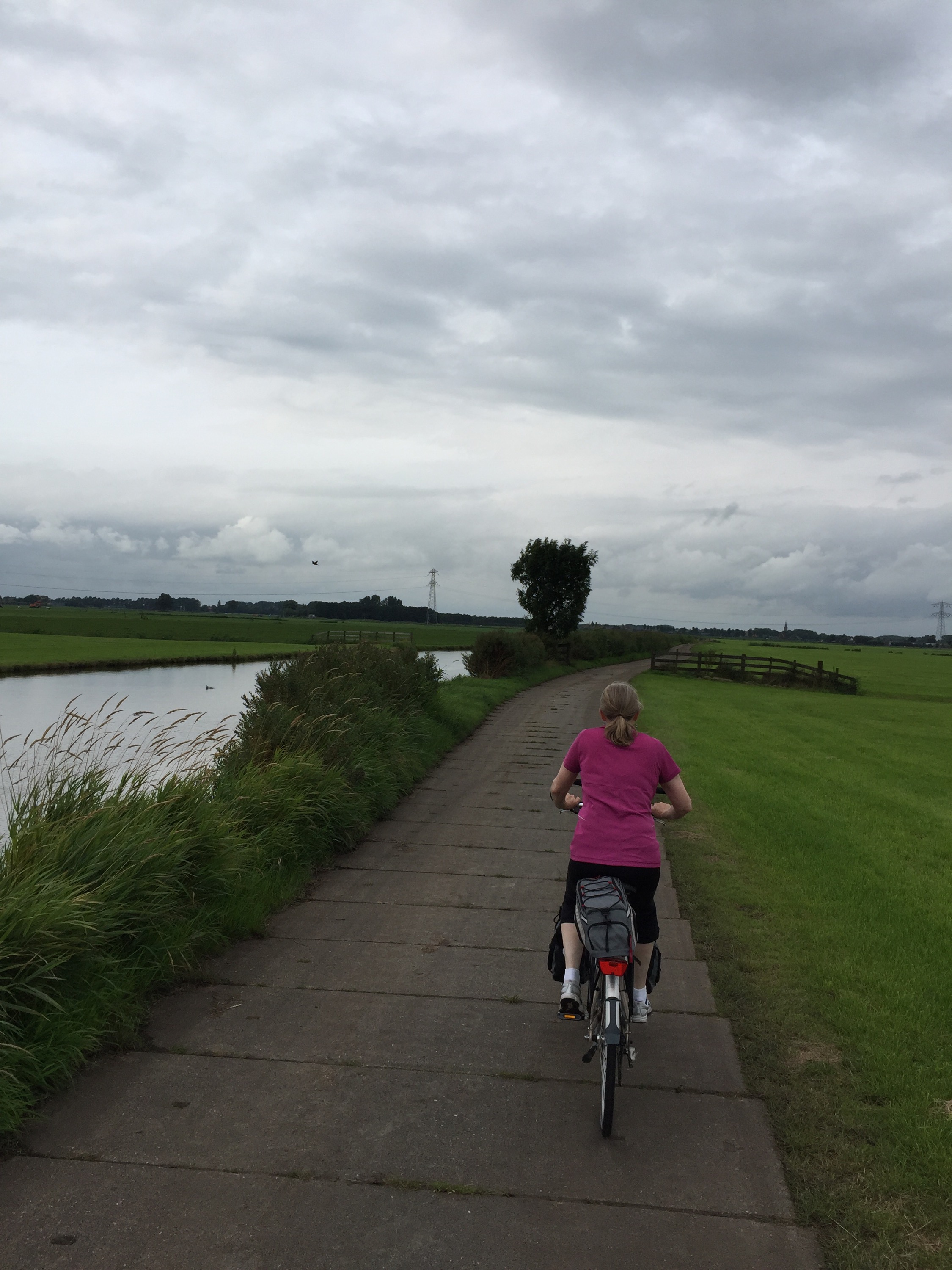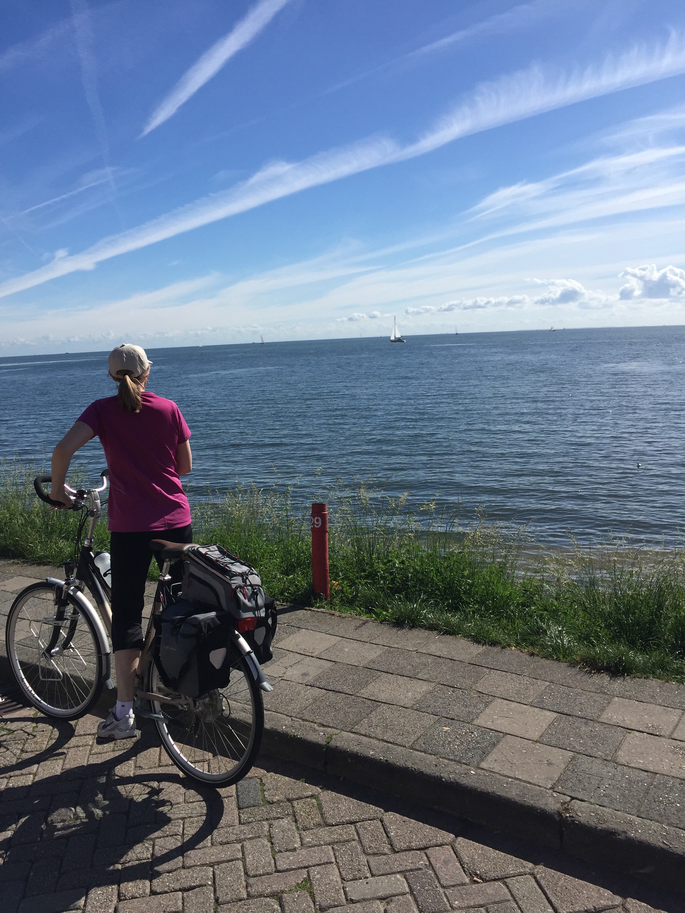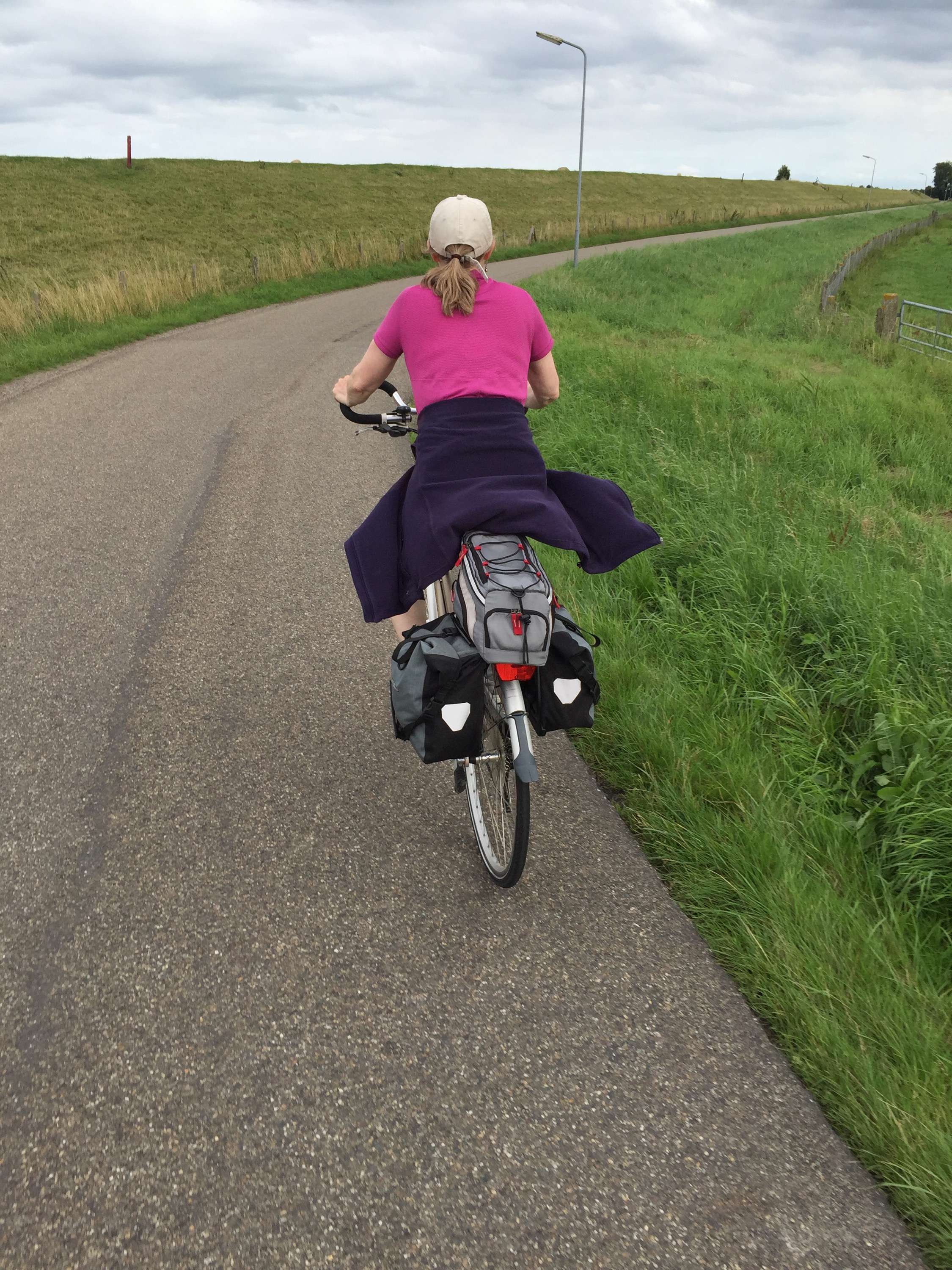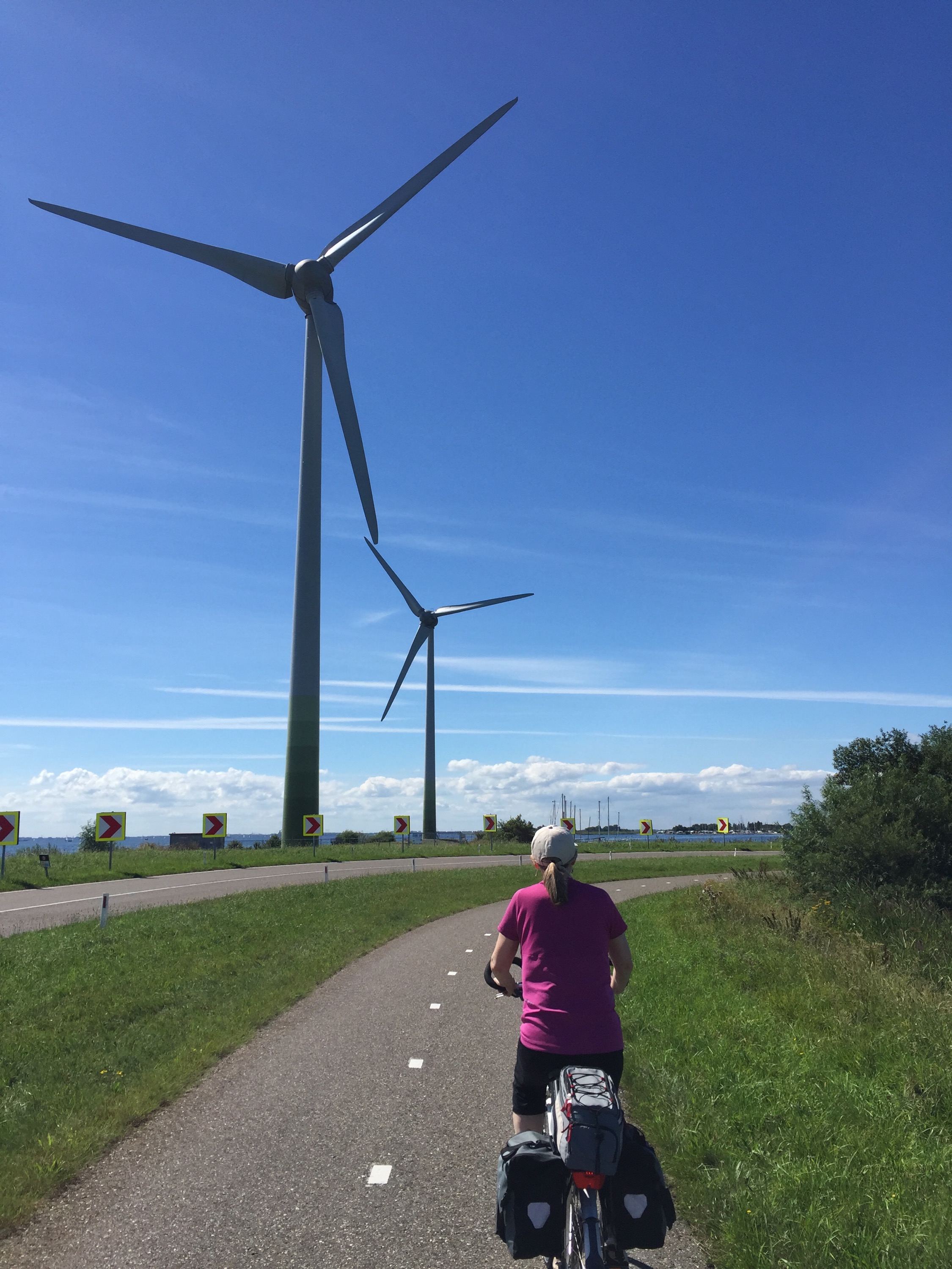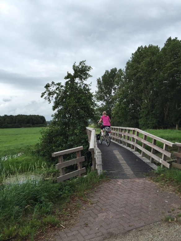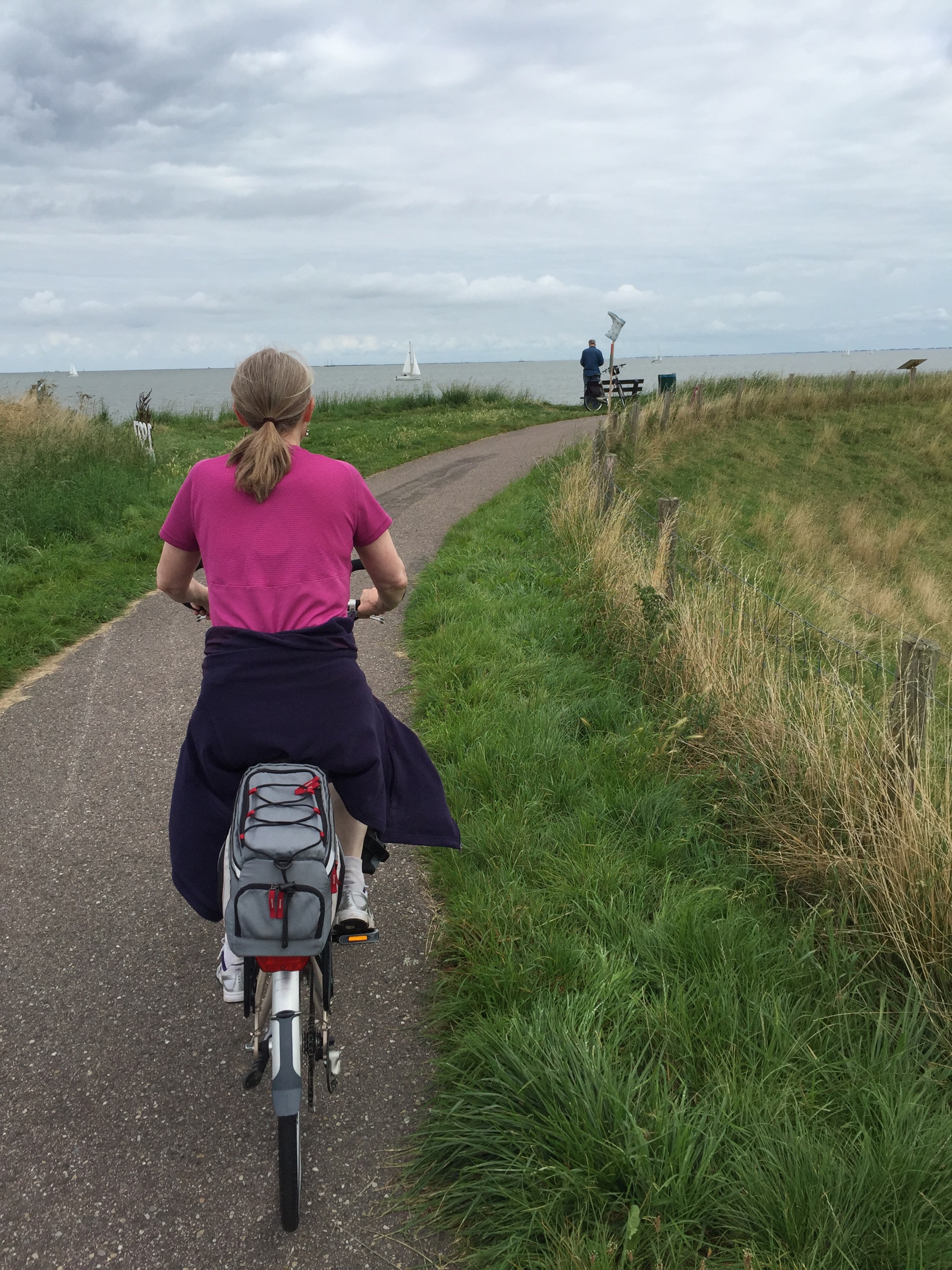 Here is another angle when the bike path goes along the side of the dike instead of on top of it. The bike path itself is well below the sea on the left, which you cannot see but imagine the sea on the other side above the level of Leisa’s head.