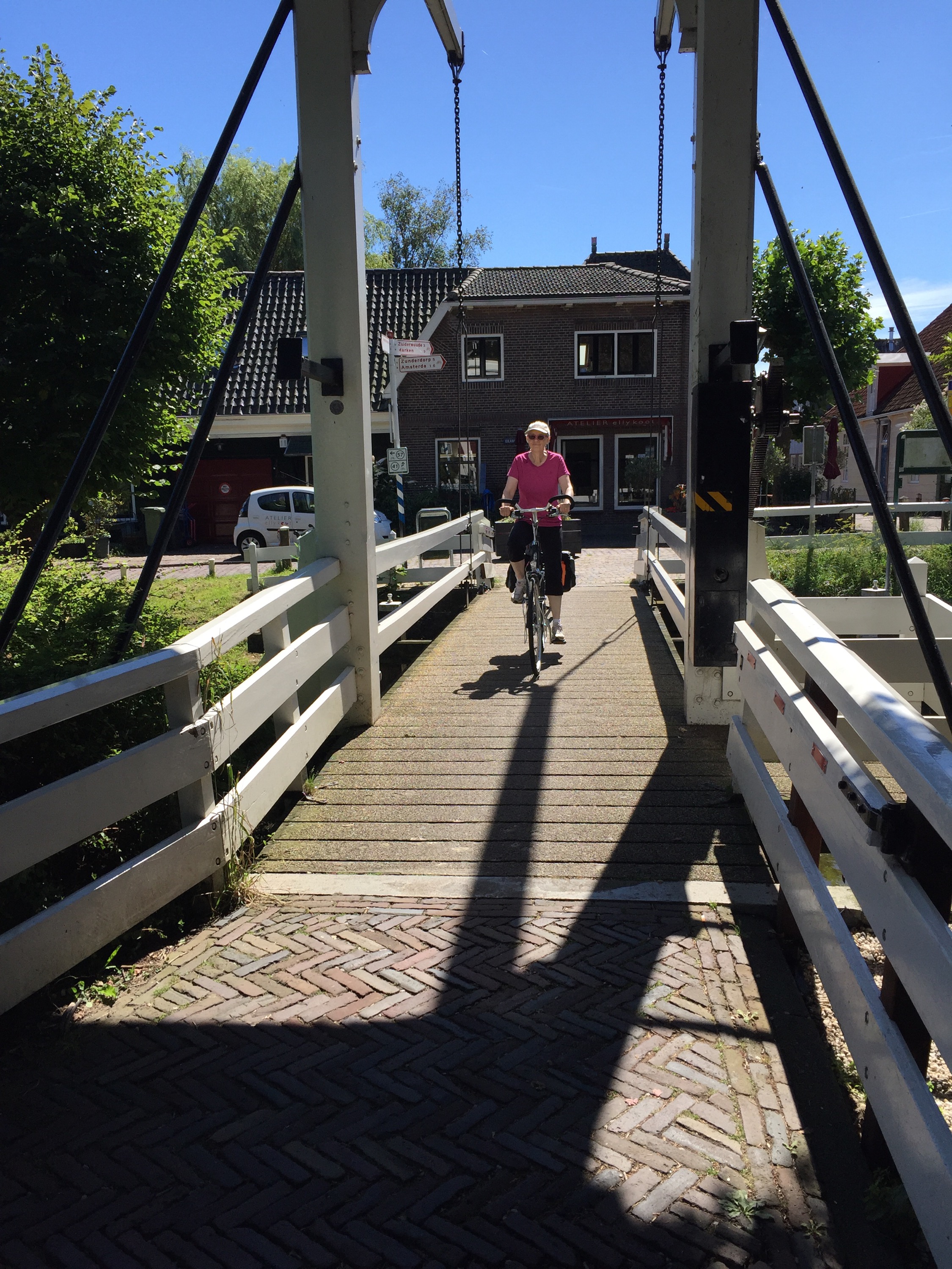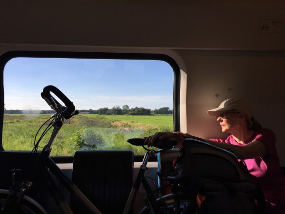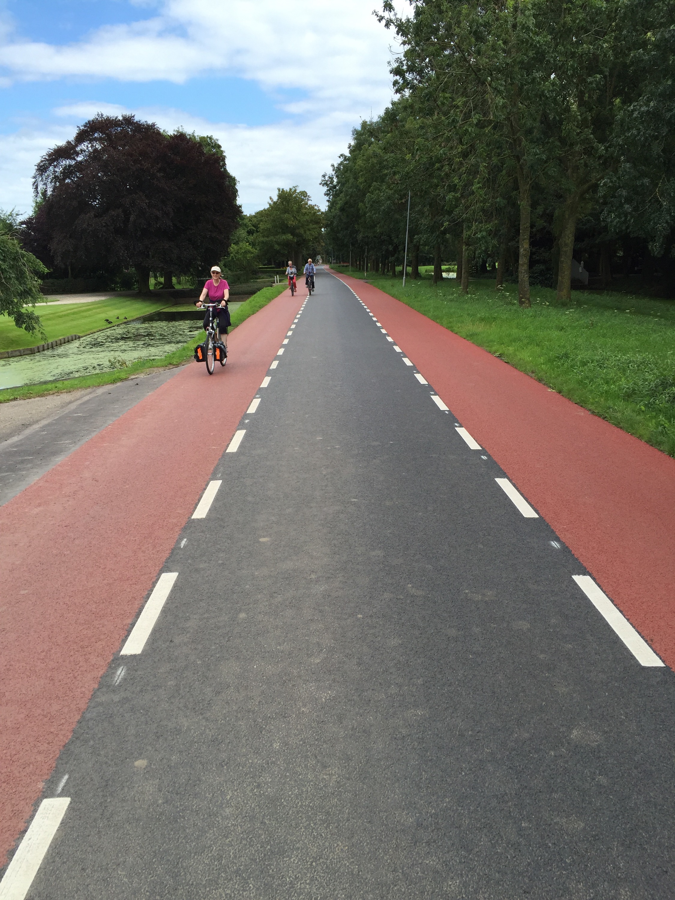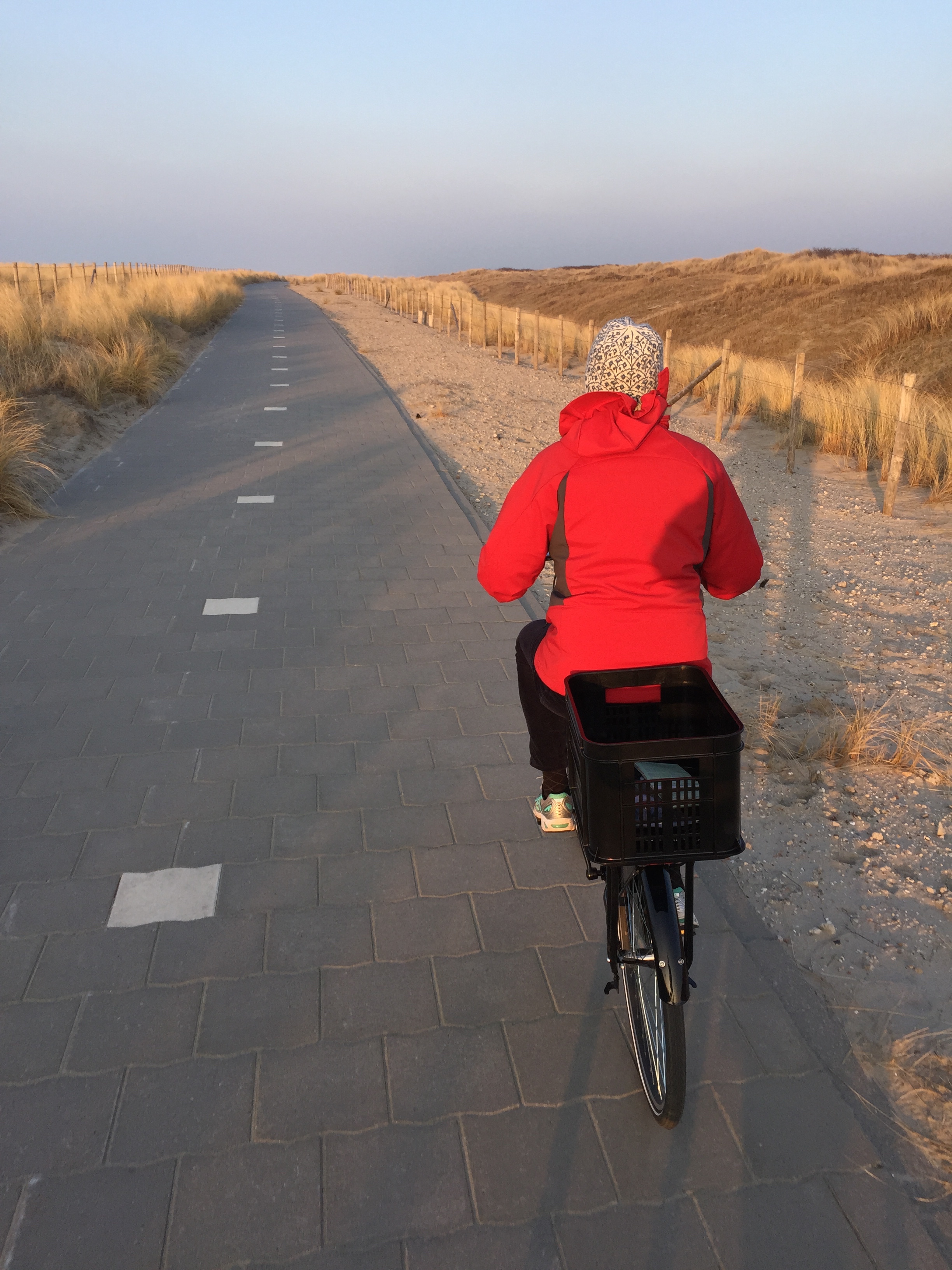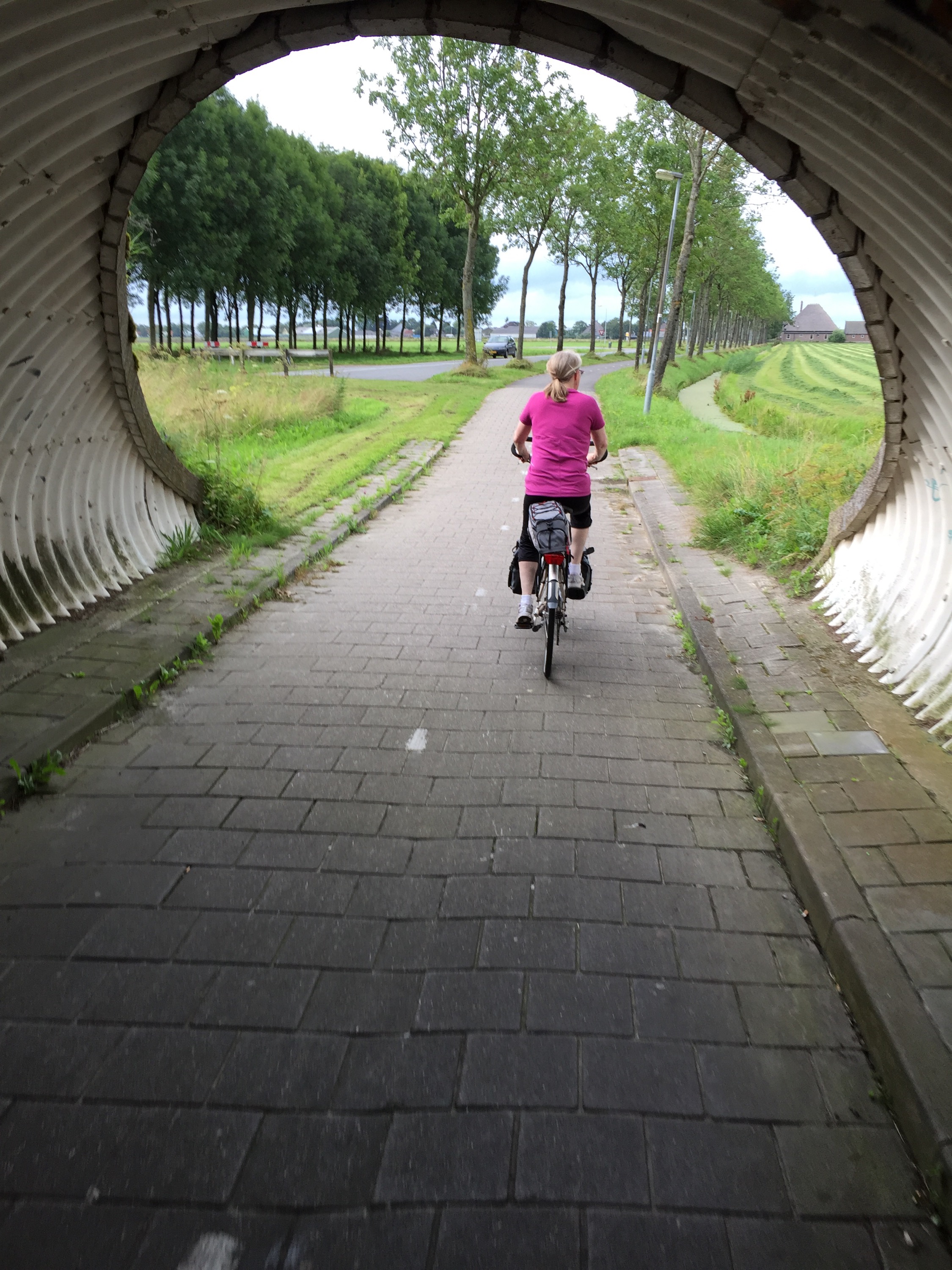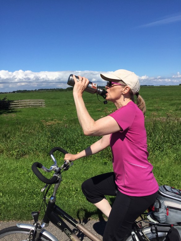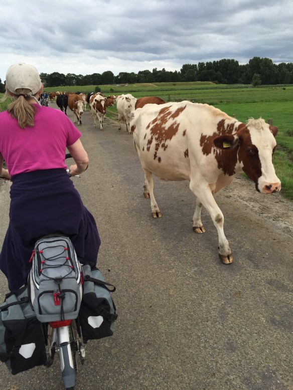 Here is another angle when the bike path goes along the side of the dike instead of on top of it. The bike path itself is well below the sea on the left, which you cannot see but imagine the sea on the other side above the level of Leisa’s head.
