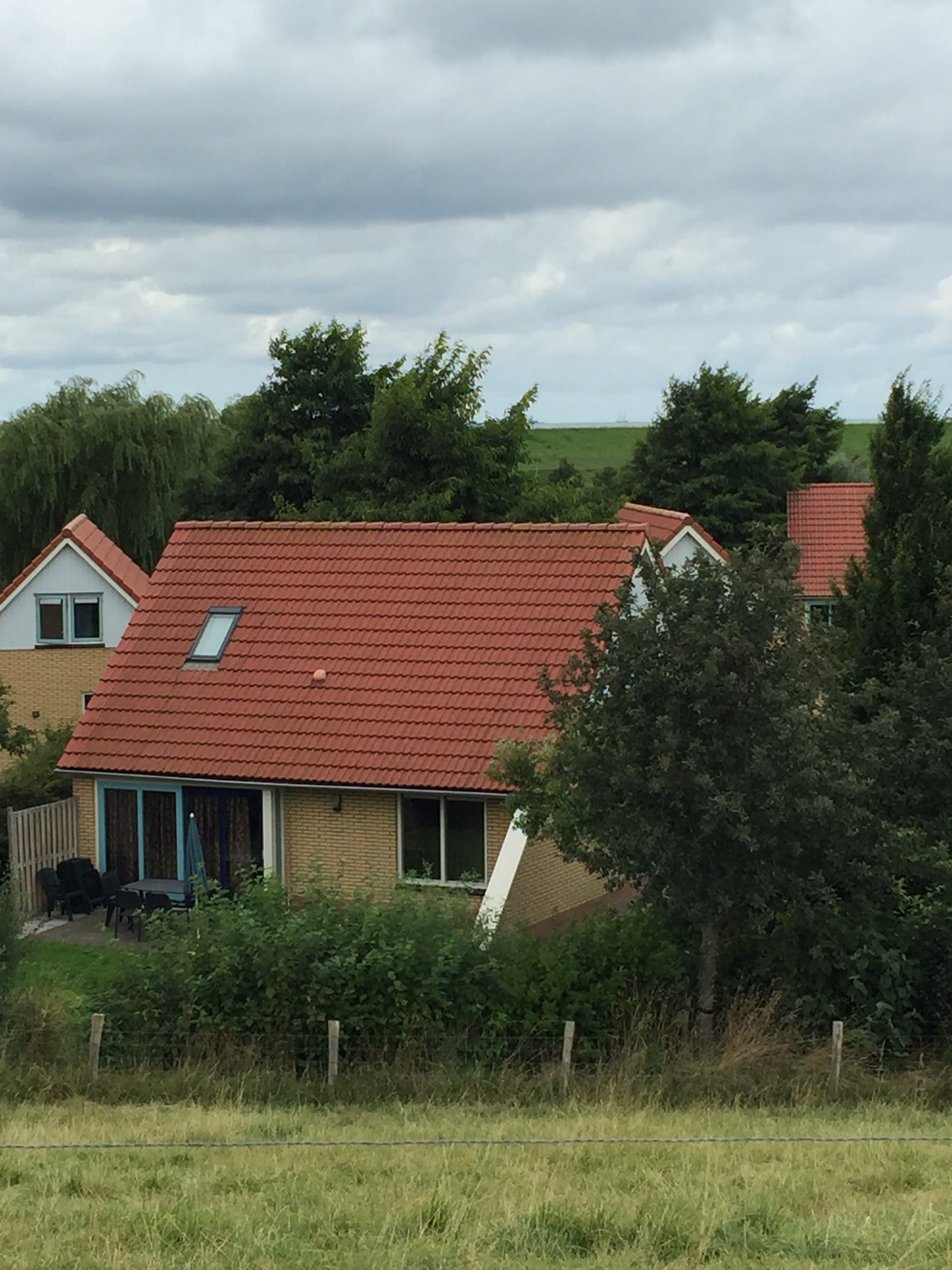 Even in beautiful scenery and nice weather, there is something ominous about cycling along the top of the dike with the sea on one side of you and on your other side homes and farms well below the sea. Hard to capture in a photograph but if you look closely out to sea, you can see a boat sailing on the sea at about the same level of the roof of the houses behind the dike.