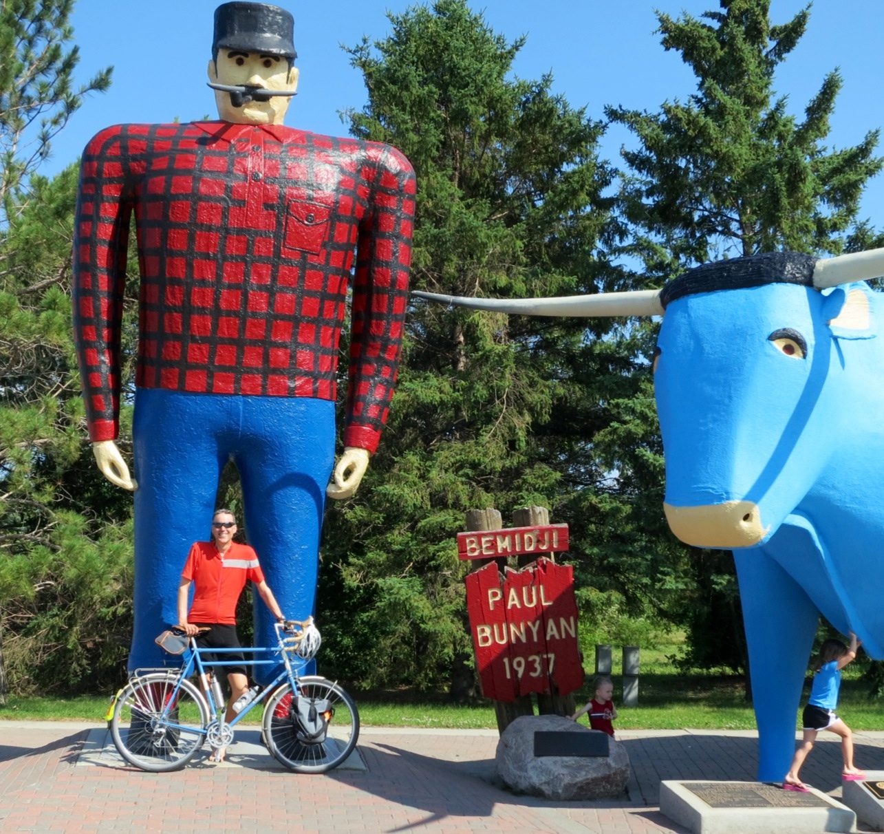I make it from Fosston to Bemidji, Minnesota in time for long lunch at a funky coffee shop. We decide to make it a short day and stay in this town that lays claim to being the home of Paul Bunyan. We try for over an hour to find a place, even a place to camp. There is a big little league baseball tournament in town and it is the weekend following July 4th so nothing is available in this lakeside town.