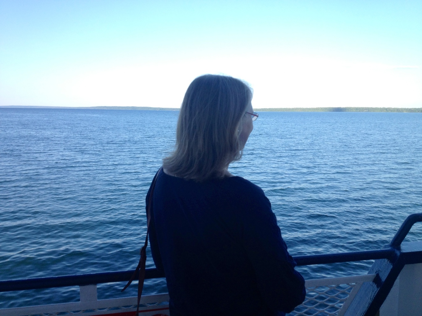 I pedaled through what seemed like endless road construction, some with very little space for a cyclist. And all the new pavement did not have markings for a shoulder so I felt quite exposed. When I finally came upon the a long single lane section bordered by hot poured asphalt, luckily Leisa was nearby. I abandoned this section and took a tow to Route 13, which leads north up a peninsula to the Apostle Islands National Seashore and Madeline Island, where Leisa and I decide to take a rest day before she heads back to British Columbia. Turns out this is where she spent a few summer vacations as a teenager. I make it to the ferry just as it is about to lift its loading ramp. Leisa here is either contemplating how to deal with someone who is chronically late or her childhood.