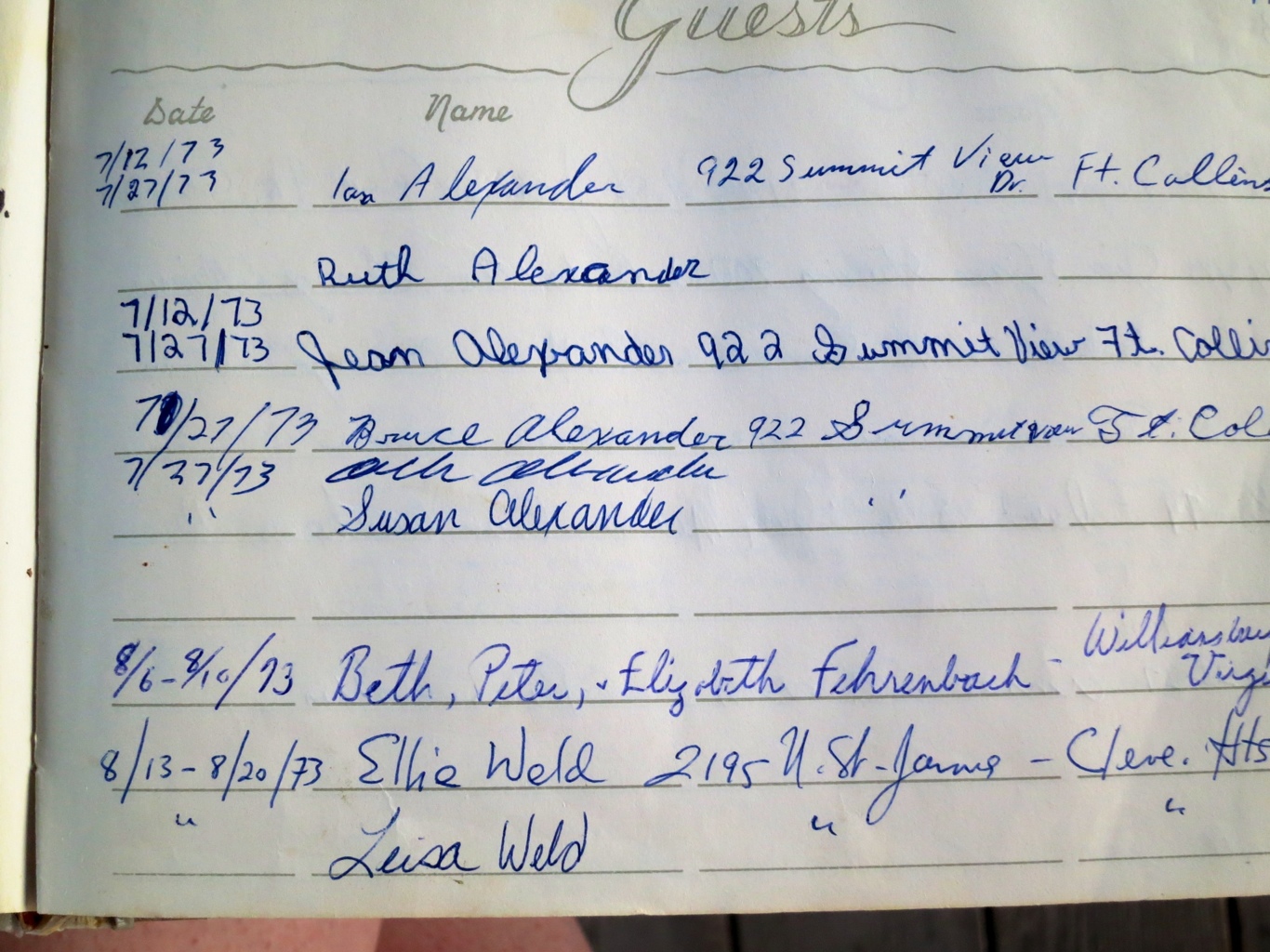 We enjoy dinner together and we find evidence that Leisa (and her mother) was here in 1973 in the guest book. An eight day stay in fact, and maybe the time Leisa, that rebel, put the extra “e” in her name. Something hatched on this very spot nearly, ummm, forty years ago.