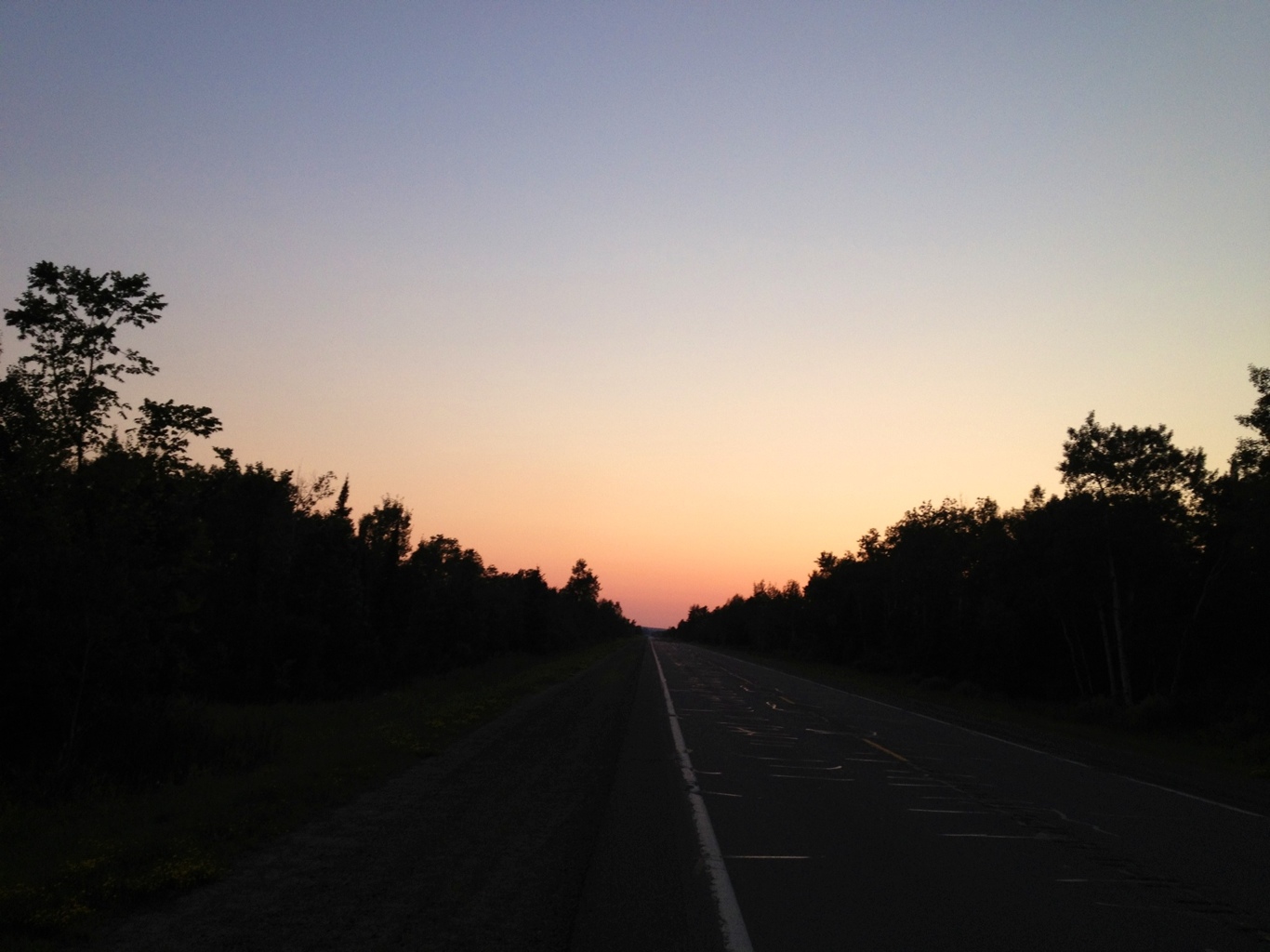 I keep pedaling towards Sault Ste Marie well after sunset. My plan is to go over the bridge close to midnight when there is hardly any traffic. There are no lanes for bicycles and there is no shoulder so that, I think is safest. The lady at the bridge toll booth agrees with me and sends me over with a wish of luck.
