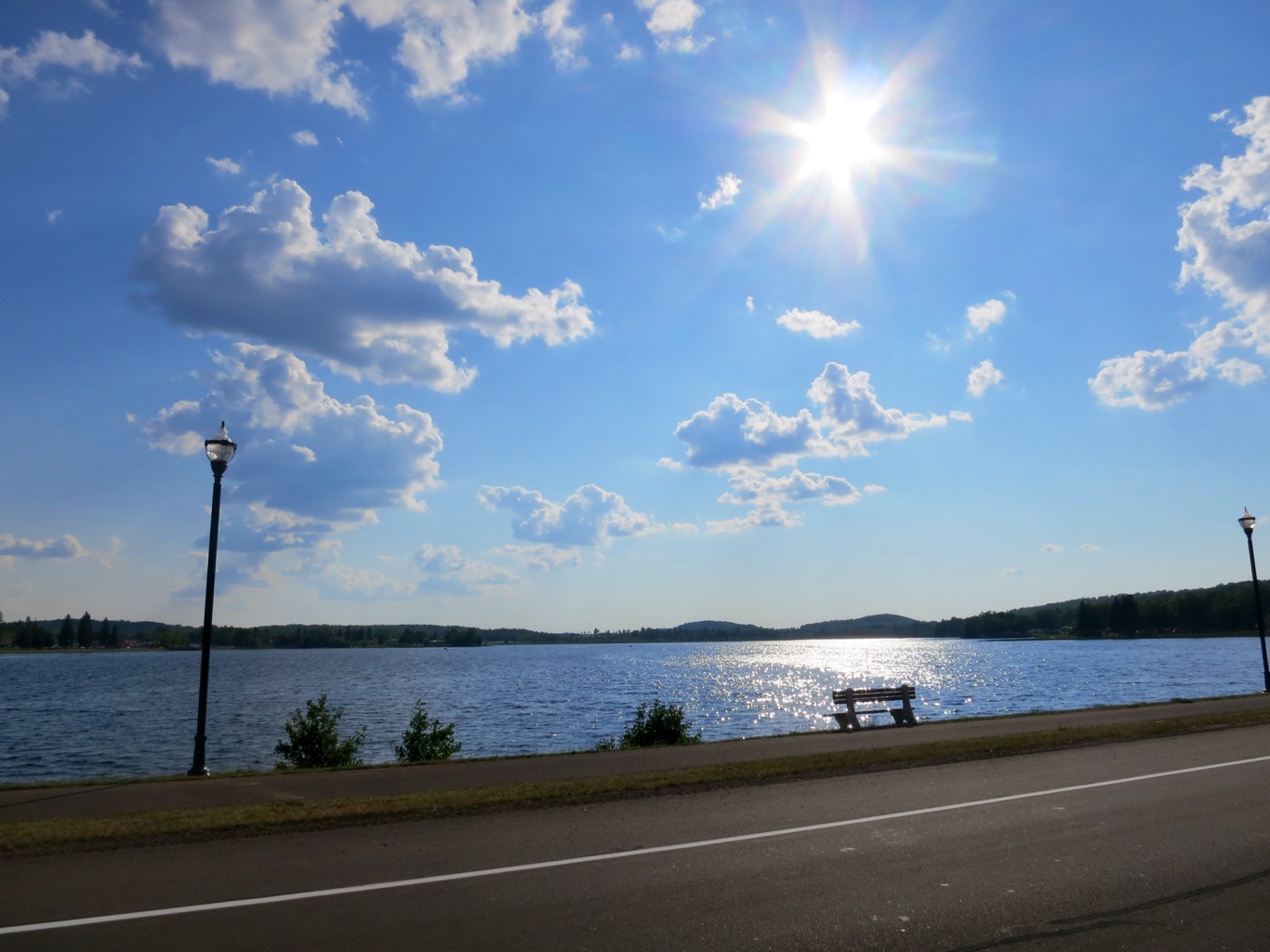 Cool temperatures, low humidity, big puffy white cumulus clouds overhead providing moments of shade now and then. It was a bit sad when I finally made it to the highway after fifty km of cycling bliss. It was back to Route 2 with its two, three and sometimes four lanes overly exposed to the sun and wind. At a lunch stop, I meet a dozen women who are celebrating eight years of friendship with a cake. Turns out all of them are widowers who get together regularly. They sweeten the rest of my ride with a big slice of cake.